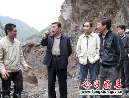 图为县委书记沈明云一行实地察看上龛乡二荒村堰塞湖河道治理工程情况
