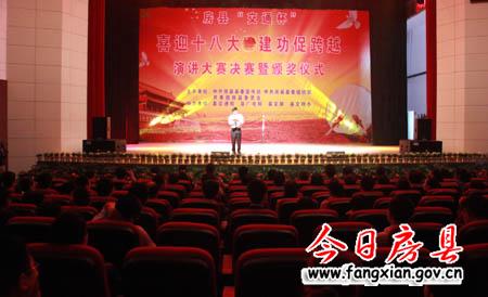 今日房县网讯 记者田兰兰 报道: 5月4日,我县“交通杯”“喜迎十八大,建功促跨越”演讲大赛决赛暨颁奖仪式在县影剧院举行。来自全县各行各业的20名选手参赛。县领导徐锦凤、陈渊、王学能出席决赛并为获奖选手颁奖。