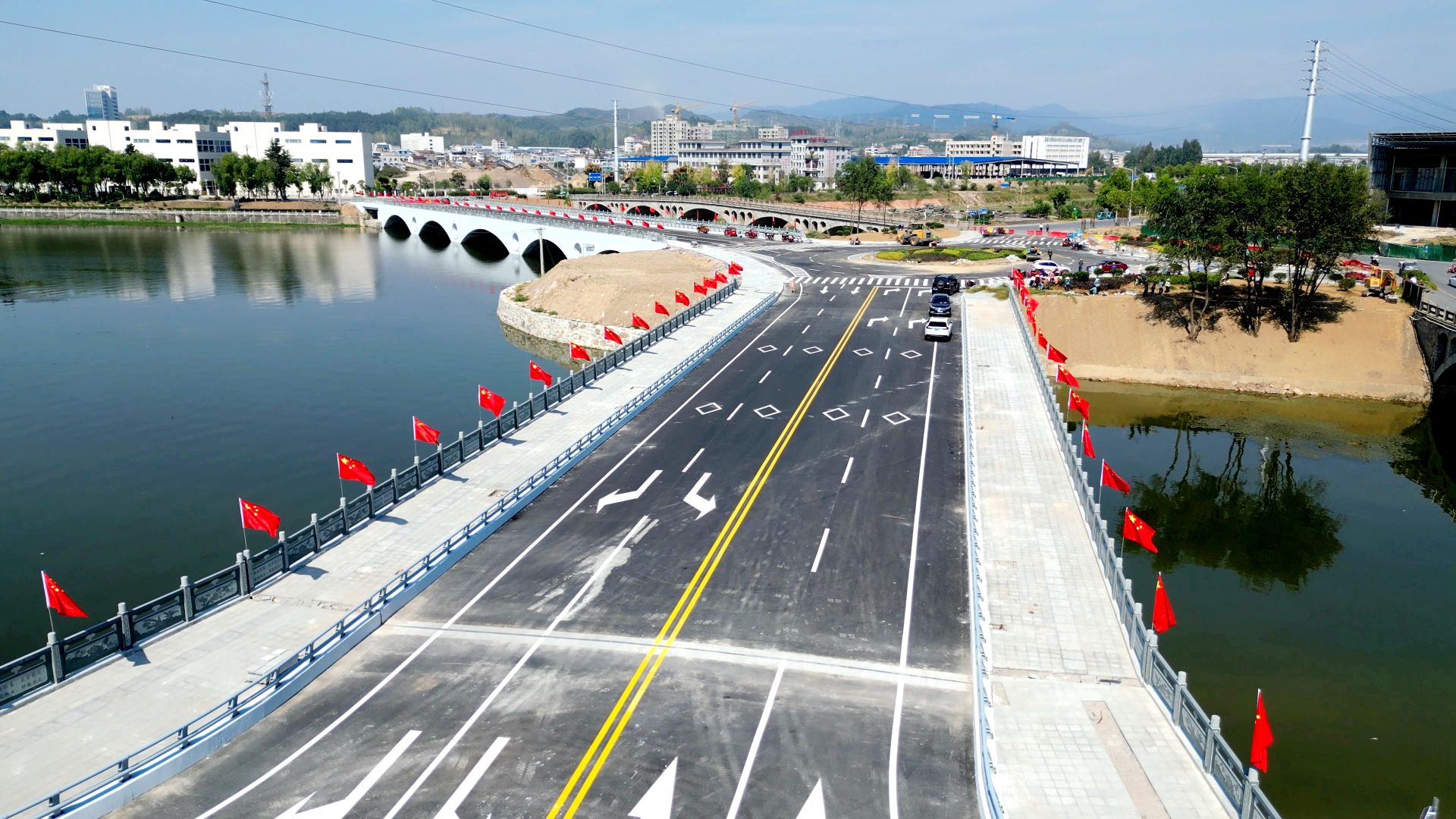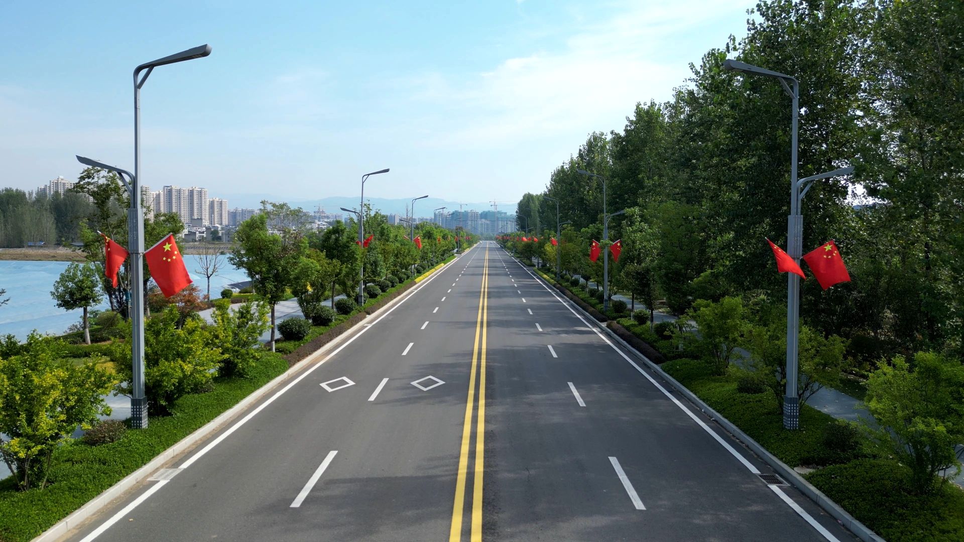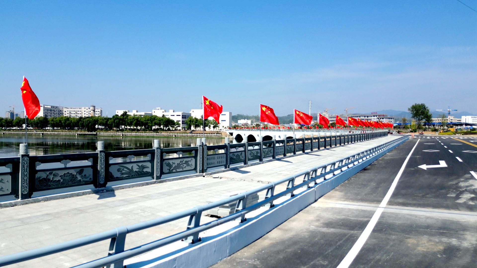 在城区白驹大桥、杨彼岭大桥、沙沟河大桥,桥梁两侧的灯杆上整齐排列的五星红旗正迎风飘扬,在阳光的映照下格外鲜艳,不仅扮靓了城区,也营造出喜庆、祥和的节日氛围,更激发了市民的爱国热情和民族自豪感。