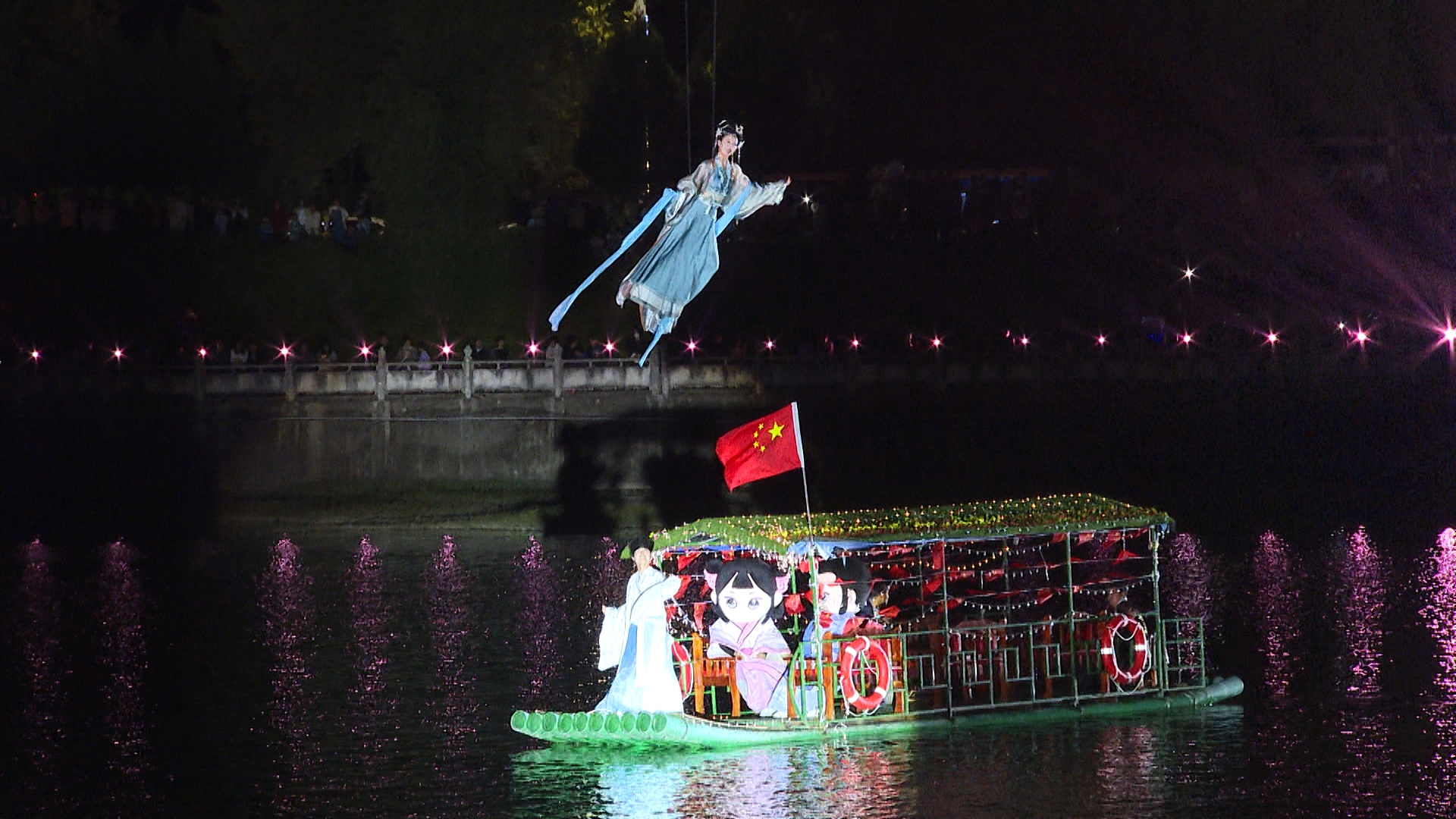 2日晚,记者在半岛湾观演现场看到随着夜幕缓缓降临,绚丽多彩的音乐喷泉和灯光秀将房县的节日氛围烘托的格外喜悦,半岛湾水域两岸早早的挤满了前来观看的群众。当日晚上8点活动在空中飞人表演《遇见房县》中拉开了帷幕,特技演员们在夜空中演绎了一场关于房县历史文化的精彩故事,通过空中飞人的高超技艺,展现了房县深厚的文化底蕴和独特的自然风光。活动现场除了《遇见房县》《诗酒远方》《我爱你中国》3场精彩的特技空中飞人表演外,还利用无人机编队则在空中绘制出了房县县城、诗经画卷、尹吉甫、黄酒、野人等具有地方特色的图案,以及天安门、祖国生日快乐等祝福语句,表达了房县人民对祖国的美好祝愿。