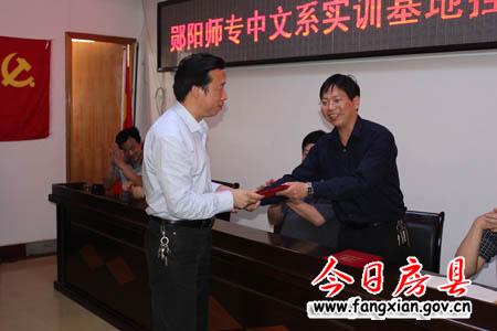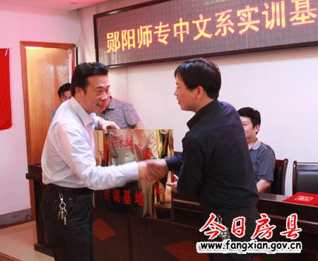 图为郧阳师专中文系主任王进为县新闻中心实习基地授牌