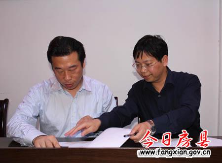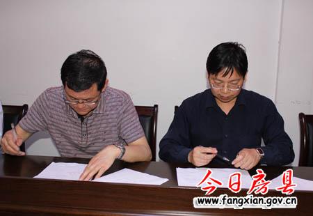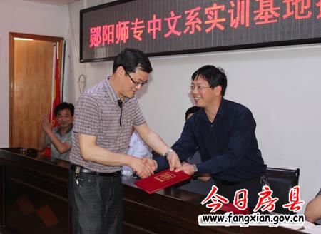 图为县委宣传部副部长陈勇与郧阳师专中文系主任王进签约