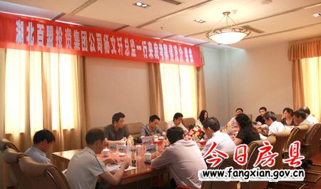 今日房县网讯 记者桂涛通讯员任仙娇报道: 11日,湖北百盟投资集团有限公司项目总监杨文轩一行来我县考察洽谈投资事宜。副县长林华,政府党组成员、工业园区管委会主任龙德斌出席座谈会,县财政局、经信局、招商局、国土资源局、住建局、旅游局等相关负责人参加会议。