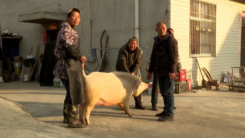 元月16号,老郭请来杀猪师傅。在村里邻居的帮助下,大家齐心协力把肉猪掀翻在案板上。经过刮毛、清洗等环节,肉猪被分解成小块。老郭打算自已留一半儿猪肉,其它都分给自已的三个子女。