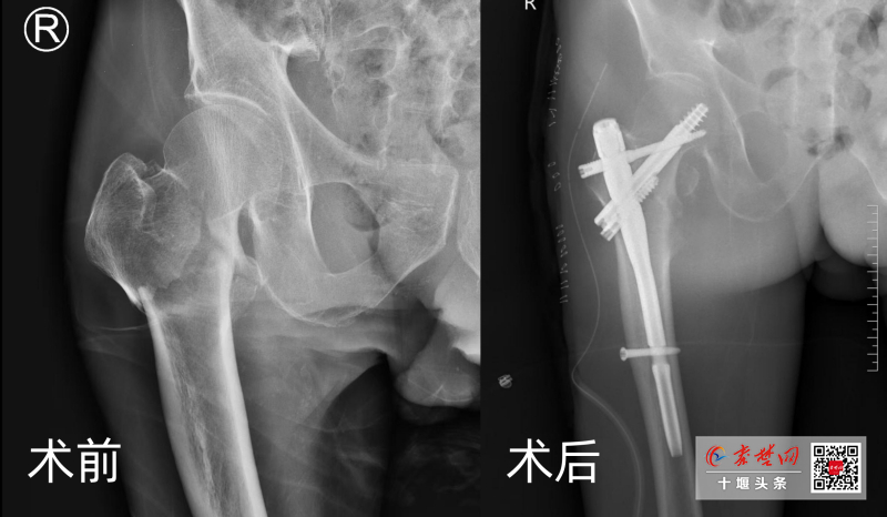 两周前,76岁的王大爷(化姓)在家中不慎跌倒,顿时感觉髋部疼痛无法起身。其子王先生得知后心急如焚,迅速将老人送往十堰人医就诊。十堰人医创伤骨科1病区副主任曹洪接诊后,通过初步体检发现王大爷髋部压痛明显,随即为其安排了髋部X光片检查。结果显示,王大爷的髋部出现转子间合并转子下的骨折。对于高龄老人而言,髋部骨折被称为 “人生的最后一次骨折”,往往伴随着长期卧床、活动能力丧失以及严重并发症,甚至致命的风险。