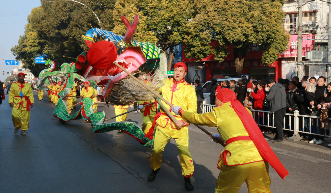 走在巡游队伍最前面的是由城关镇民间艺人带来的火龙表演,三条火龙在喧天锣鼓声中,上下翻飞,东腾西移,祈福新一年风调雨顺、五谷丰登。来自土城镇、门古寺镇、中坝乡等乡镇的群众也组织了丰富多彩的民俗节目参与到巡游活动中,现场龙腾狮跃、热闹非凡。