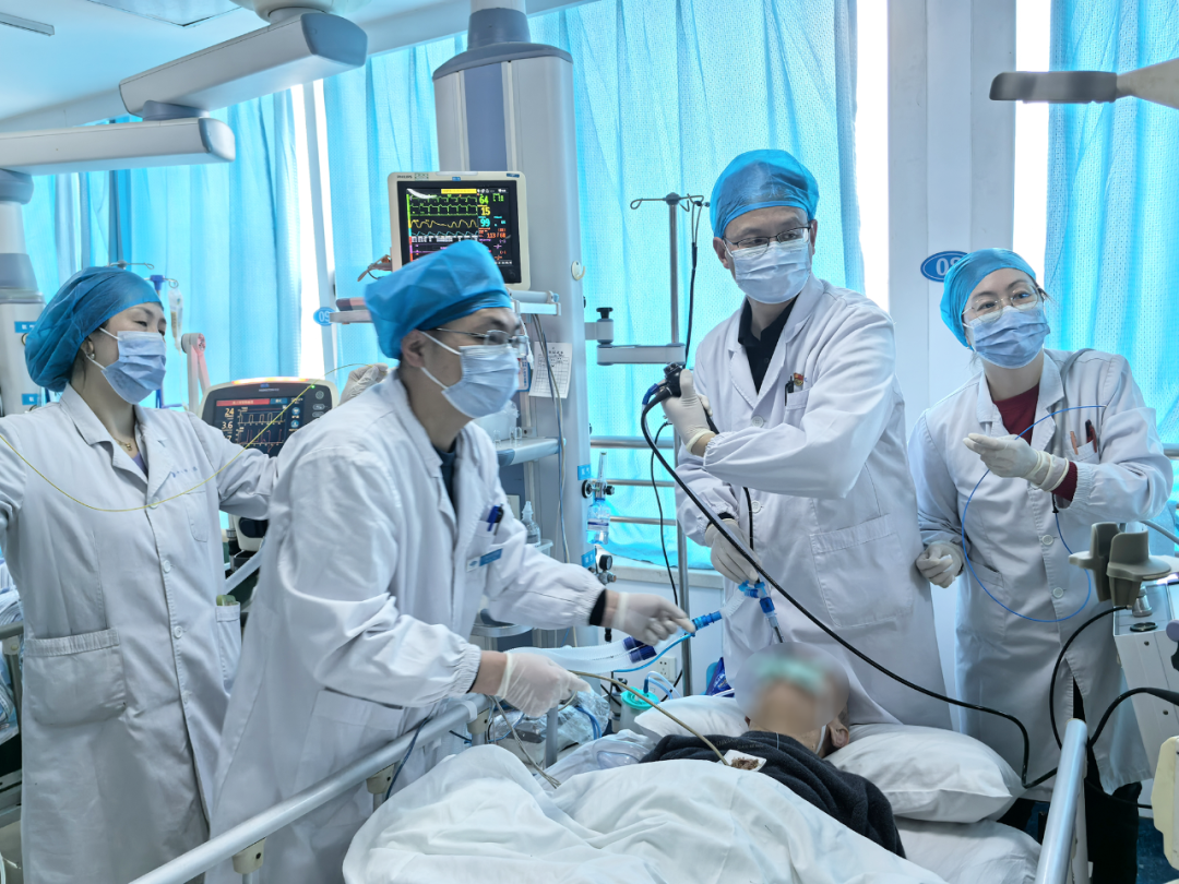 老人被紧急转入呼吸重症监护室后,考虑到其年龄大,且患有高血压、冠心病等多种基础疾病,手术风险极高,朱建勇、尹义平、张立波等手术团队决定在麻醉科全程监护下,实施硬质支气管镜下异物取出术。