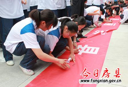 图为县实验中学学生在题为“靓丽房县 从我做起”的横幅上签名