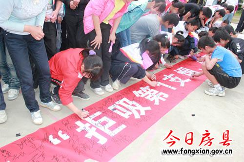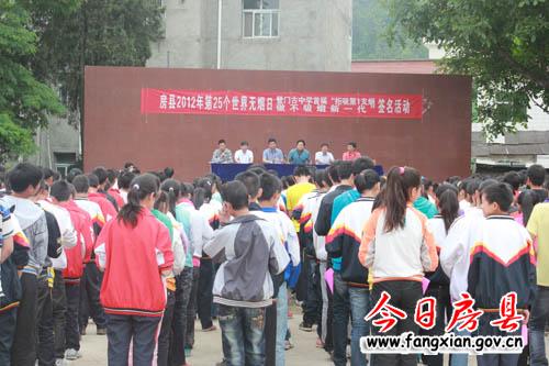 今日房县网讯 记者陈锐 通讯员邓发基 报道: 5月31日,县卫生局、关心下一代委员会、疾控中心在门古寺镇中学举行了第25个世界无烟日“拒吸第一支烟、做不吸烟新一代”签名活动。