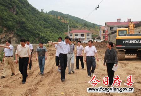 刘庆涛在万峪河乡党委书记宋爽(右一)的陪同下察看万峪集镇广场及河堤建设