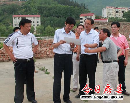 刘庆涛(左三)在青峰镇党委书记丁杰(左二)、镇长李伟(左一)的陪同下察看青峰中学校安工程