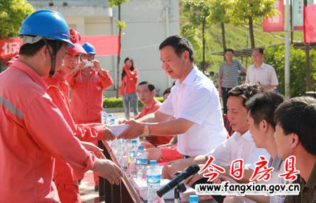 图为县安委会副主任、安办主任、安监局局长李勇为华新水泥职工颁发安全知识手册