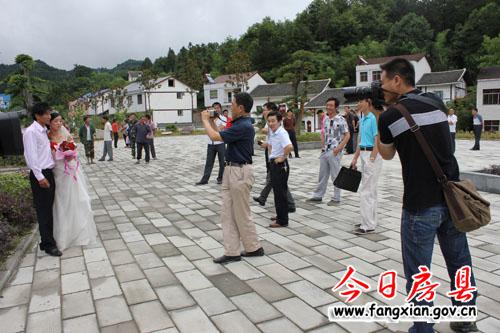 图为十堰日报摄影记者在窑淮乡界山广场采访一对结婚的新人