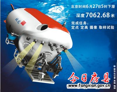 6月27日,在第二次的7000米深度——7062米的海底,“蛟龙”再次完成了坐底、水体取样、沉积物取样、标志物布放、摄像、照相、高精度海底地形测量等深海调查作业,全面验证“蛟龙”的设计指标和功能性能,证明这是一条可堪重任的“中国深海蛟龙”。