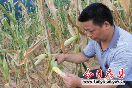 今日房县网讯 通讯员刘中华 杨大文报道: 2日,尹吉甫镇珠藏洞村农民刘建国眼见着自家苞谷干死在地里却无能为力。连日来的高温少雨天气,导致该镇5000多亩的旱坡地庄稼还未成熟就干死在地里,快成熟的苞谷被高温烤焦,一片枯黄,一点就着,几乎绝收。