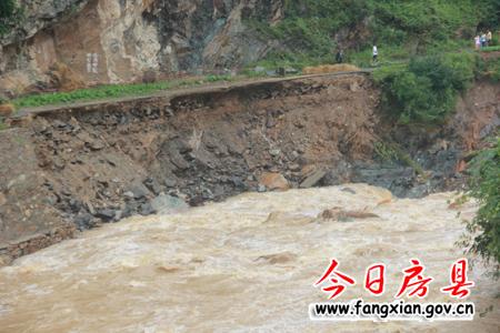 王家波一行先后察看了青万公路、通村公路、集镇河堤水毁情况。记者在现场看到,青万公路与集镇交接处,近30米县乡公路被冲毁,车辆无法通行,仅容一人步行通过;万峪集镇通往班河的通村公路被全部冲毁,行人和车辆均无法通行。