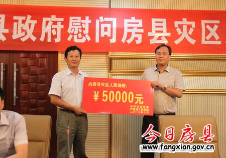 今日房县网讯 记者 吴宏强 报道: 14日,竹溪县委常委、县委办主任、统战部部长蒋波,副县长赵帆一行来我县慰问灾区群众,并代表竹溪县委、县政府及竹溪县37万人民向我县灾区群众捐赠5万元现金。县委副书记张慧彬,县委常委、县委办主任张永平,县委常委、副县长姚天国出席捐赠仪式。