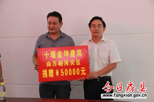 图为县十堰金坤建筑向万峪河乡捐款5万元