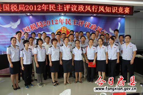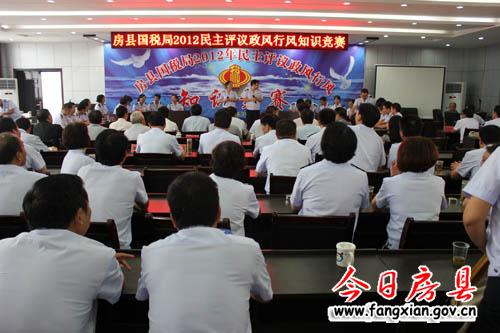 今日房县网讯 记者陈锐 通讯员党天成报道: 31日,县国税局举行2012年民主评仪政风行风知识竞赛,县国税局局机关、稽查局、城区分局、军店所、野人谷所、青峰所六支代表队参加比赛。比赛由国税局行评监督员担任评委,百余名国税干部职工现场观看了比赛。