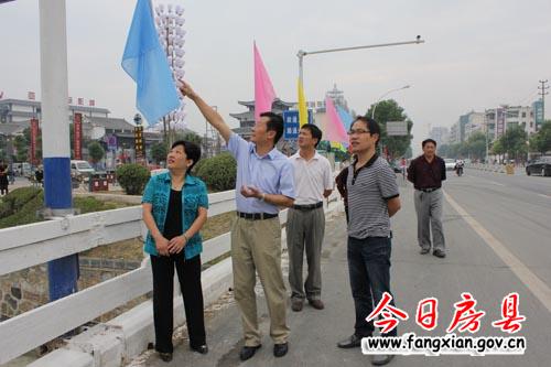 图为姚天国(右二)、袁堂珍(左一)察看北门河桥彩旗及绿化情况