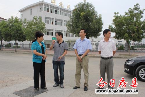 图为姚天国(左二)、袁堂珍(左一)察看唐城广场、西河桥彩旗、宣传牌安置等情况