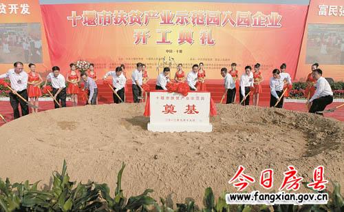 张昌尔宣布秦巴山片区十堰市扶贫产业示范园入园企业开工。出席开工仪式的各位领导共同为示范园奠基(如图)。
