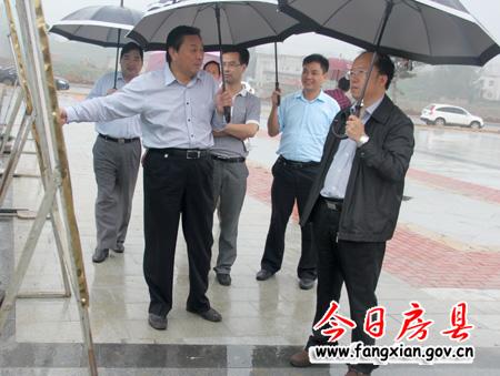 图为省扶贫办副主任柳长毅在县委书记沈明云、副县长高明哲陪同下调研双柏小区移民搬迁工作