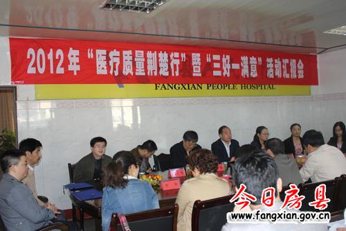 在工作汇报会上,县人民医院院长车向表示,县人民医院根据省卫生厅和市卫生局相关文件精神,结合医院实际情况,以“医疗质量荆楚行”活动为平台,以“三好一满意”活动为重点,紧密结合“优质护理示范病房、抗菌药物专项治理、创先争优、治庸问责”等活动,着力提升医疗水平,持续改进医疗质量,切实保证医疗安全,大力弘扬高尚医德,努力构建和谐医患关系,创建人民群众满意医院,取得了明显的成效。