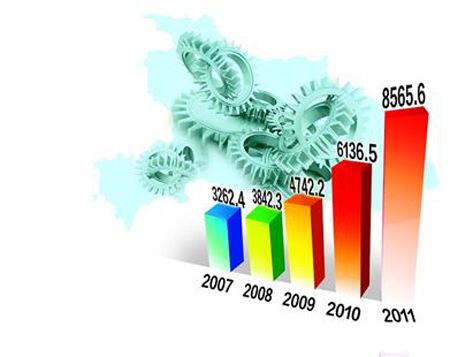 2011年,全省规模以上工业增加值跨越8000亿元台阶,达到8565.6亿元,5年年均增长27.3%。规模以上工业增加值占全省GDP的比重达到43.7%。