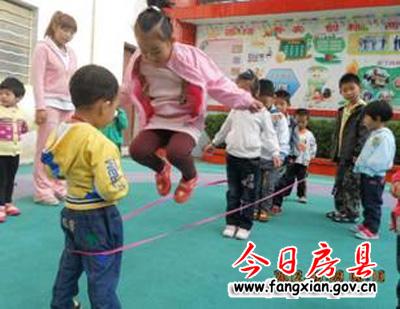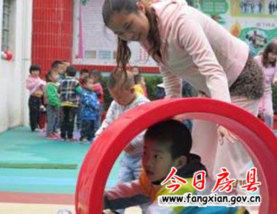 图为孩子们们在老师的看护下玩游戏