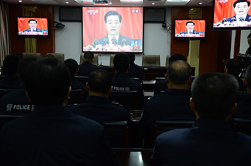 上午8点50分至10时40分,房县政府党组成员、公安局长柯正洪,政委张耀轩,副局长郭怀生等领导及局直单位除值班执勤以外的全体民警在县局607会议室收看收听十八大的开幕式,很多党员干部都不时地用笔记下报告中的重要内容。
