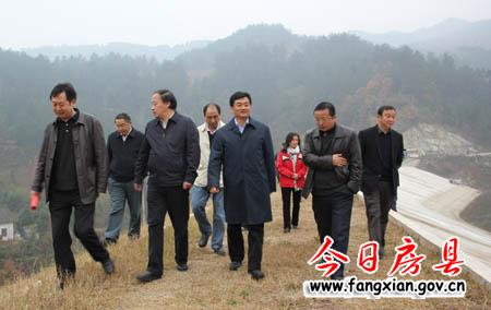 图为水利部规划司副司长吴强(右三)在县领导王家波、吴永强、高明哲陪同下察看白峪沟水库加固工程