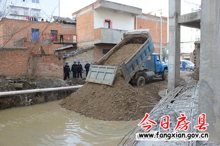 县城管执法大队工作人员在现场监督地基填埋工作
