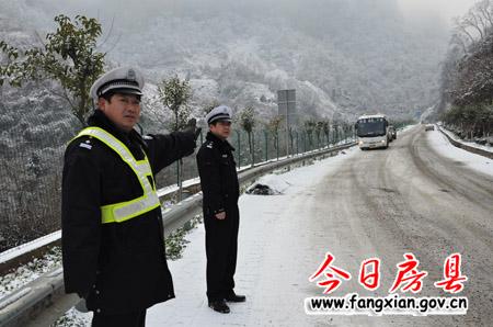 今日房县网讯 通讯员魏世银 汪莹 唐维德 报道: 25日,我县迎来冬季又一场大雪。235 省道十堰至房县柳树垭路段因山高,路面全部积雪冰冻,导致车辆通行困难。驻守此地的县公安局交警大队三中队的6名同志抗严寒、战冰雪,坚持在路面指挥引导车辆通行,并无偿提供防滑链。经过10多个小时的连续奋战,至26日12时 ,途径此地以及短时间受阻的多辆重载大型车辆全部顺利通过冰雪路段,结冰最严重的10余公里山路未发生一起交通事故。驾驶员称他们为:冰雪路上的最美交警!