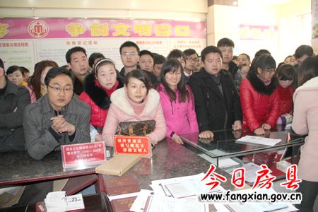 今日房县网讯 记者刘臣 向强 实习生张括 报道: 2013年1月4日本是一个平常的日子,却因数字谐音“爱你一生一世”,被网友热捧为“万年真爱日”。当天,县内众多情侣一大早就在县民政局婚姻登记处排队等候领证。