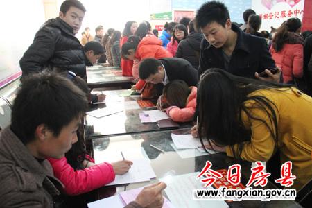 记者在现场了解到,县民政局婚姻登记处及时增设登记窗口,延长工作时限,并在门口贴出了“今天只受理结婚登记”的字样,最大限度的为结婚人群提供方便。登记大厅内,四周贴满了结婚登记流程告知,负责咨询服务的工作人员也忙个不停,领表、填表的人更是将现场挤得水泄不通。