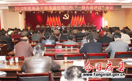今日房县网讯 记者赵爱平 刘臣 报道:8日,我县召开2012年度干部选拔任用工作“一报告两评议”会议,对2012年度干部选拔任用工作情况进行民主评议,并对2012年度新选任的党政主要领导干部进行民主测评。县委书记沈明云代表县委常委会,对全县2012年度干部选拔任用工作情况作了专题报告。