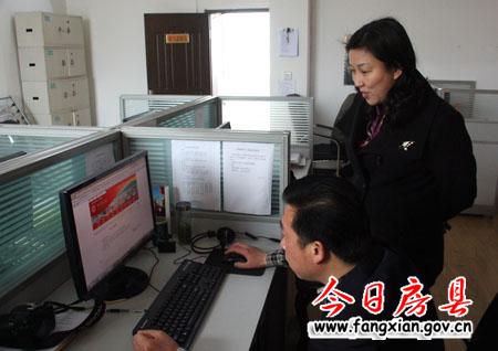 图为副县长林华在新闻中心采编室察看报纸编排工作