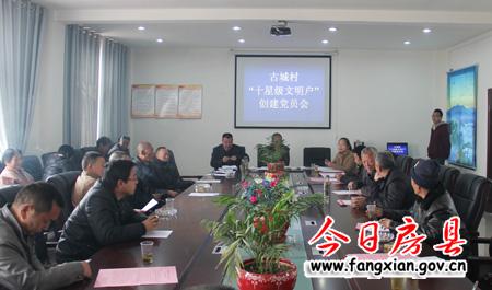 今日房县网讯 记者刘臣 实习生王玮 报道:15日,在化龙堰镇古城村“十星级文明户”创建党员会上,该村30多名党员带头学习了评选细则,填写了“党员评星公开承诺书”,这为全镇“十星级文明户”评选活动拉开了序幕。