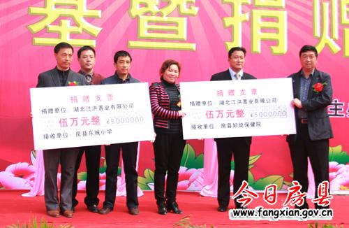 今日房县网讯 记者刘臣 报道:30日,在鸿江学府项目开工奠基仪式上,项目开发商湖北江洪置业有限公司向县东城小学、县妇幼保健院各捐赠五万元,用于支持我县教育和卫生事业发展。