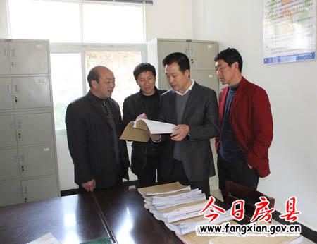 县委常委、县政法委书记杜启学 翻阅查看青峰镇综治工作档案资料