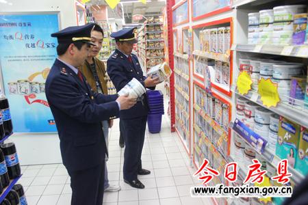 图为工商执法人员正在对中百仓储超市奶粉进行检查