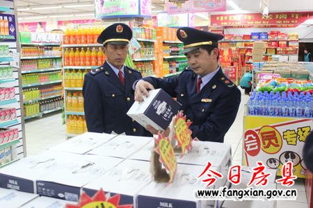 图为工商执法人员正在对寿康超市牛奶进行检查