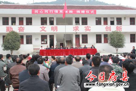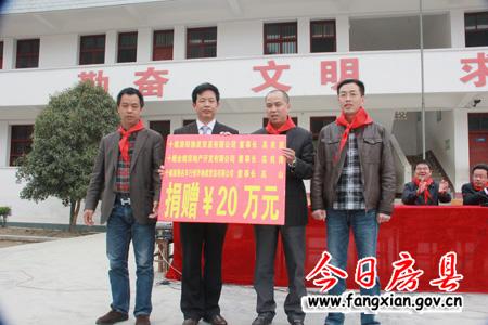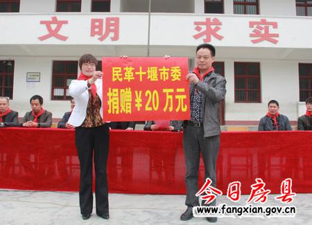 在“同心同行情系家园”的爱心助学捐赠仪式上,民革十堰市委向五台乡中心小学捐款20万元。还有十堰源阳物质贸易有限公司、贵州六盘水方盛鸿翔汽车贸易有限公司等民营企业的代表,共同捐款30万元,支持家乡基础教育事业发展。