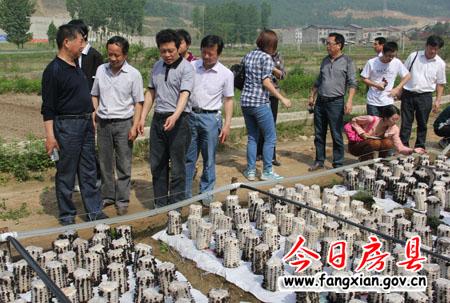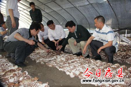 图为边银丙一行在湖北盐业集团福绿源食用菌科技公司香菇生产基地察看香菇生产情况
