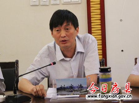 图为县委常委、常务副县长刘庆涛向检查组汇报工作