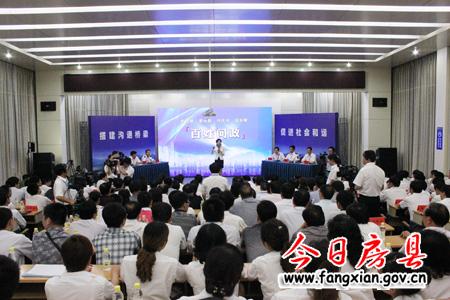 今日房县网讯 记者刘臣 杨鹏 报道:28日晚8点,城区西水路“马路市场”占道经营、桃源村造纸厂地下排污、“问题水泥砖”流入市场……等一个个民生热点,都被聚焦在房县首届电视直播节目《百姓问政》上,并由县城管局、交通局等6个县直单位的负责人一一做出解答。县领导王家波、刘庆涛、徐锦凤、胡维英、林华、张延贵,由36名行评代表、人大代表、政协委员组成的评审团,及部分乡镇、县直单位负责人共同参与了现场直播。