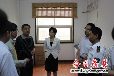 图为国家质检总局党组副书记、副局长杨刚(左三)在县质监局综合业务科了解我县质监工作情况