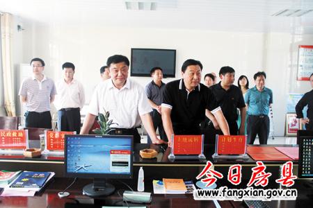 图为竹溪县委书记余春存、县长余世明一行在县委书记沈明云等领导的陪同下考察军店镇双柏村便民服务中心。