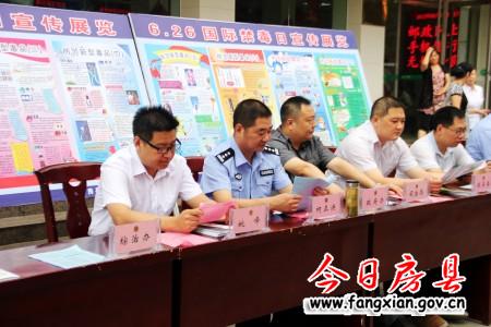 今日房县网讯 记者田兰兰 通讯员赵汗青 报道: 6月26日是国际禁毒日,当天上午,县禁毒委员会组织公安、司法、卫生、教育、邮政、妇联等禁毒成员单位,在新十字街邮政局门前开展“6·26”国际禁毒日宣传教育活动,号召广大人民群众远离毒品、珍爱生命、参与禁毒,共建和谐房县。副县长姚峰,县政府党组成员、公安局长柯正洪参加活动。